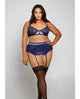 A Lingerie set to seduce, this sassy bra set features strappy cut-out lace cups, satin bow accents, adjustable spaghetti straps, a hook and eye back closure, a matching waist belt with rhinestone accents, a strappy lace g-string panty with adjustable garter straps, and matching lace top thigh high stockings. (Jewelry not included.)