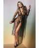 Hook front closure with a vented split opening. Includes matching sheer lace mini G-string.