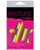Glitter Rainbow Nipple Pasties by Pastease are hand-made in the USA of durable, shiny pleather material that forms to curves and resists wrinkling over hardening nipples. Just peel-and-stick on clean, dry skin. All Pastease feature latex-free, medical-grade, waterproof adhesive that stay securely in place for as long as you like and until they are gently removed. Dimensions: 3 inches wide x 3 inches tall Coverage: 1.6 inches