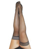 Black fishnet thigh-high with a non-slip grip. From Kix'ies. Black, Size C. Height: 4'11" - 5'5". Weight: 140-240+ lbs. Thigh Circumference: Up to 30".