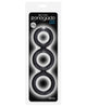 Super stretchy silicone rings in three sizes (30mm, 35mm, and 40mm) provide endless combinations of restrictive enjoyment. Suitable for all lubricants. Wash with soap and water after use. From NS Novelties.